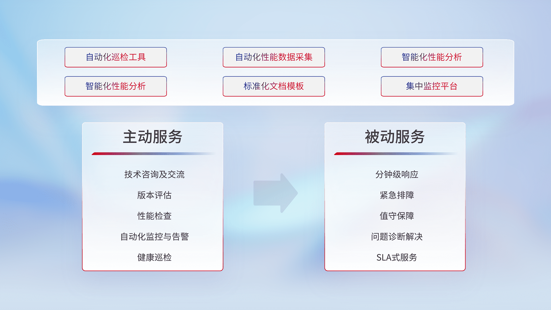 智能化工具和标准化文档,,保障服务质量,,提供主动服务(包含技术咨询、、版本评估、、、、性能检查、、、、自动化监控与告警、、健康巡检)和被动服务包含(分钟级响应、、、紧急排障、、值守保障、、、、问题诊断解决、、、、SLA服务)。。。。